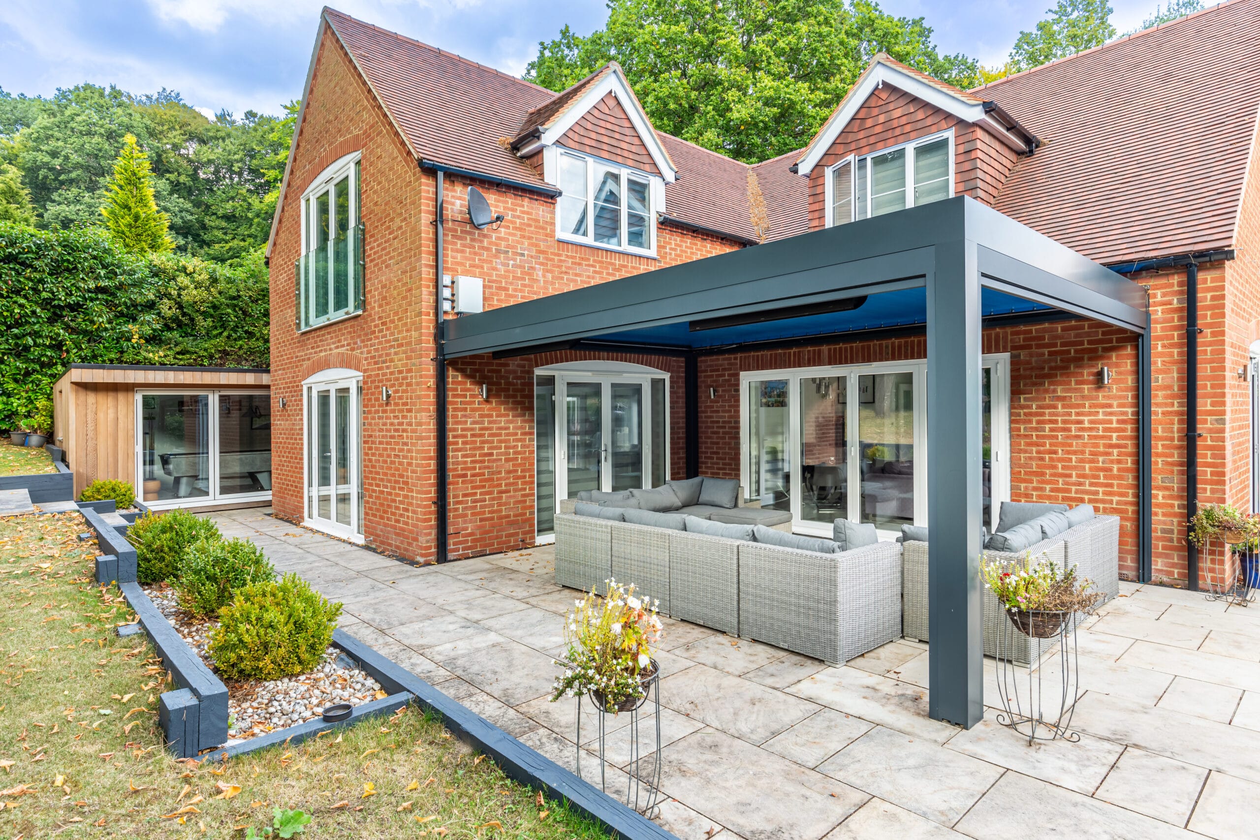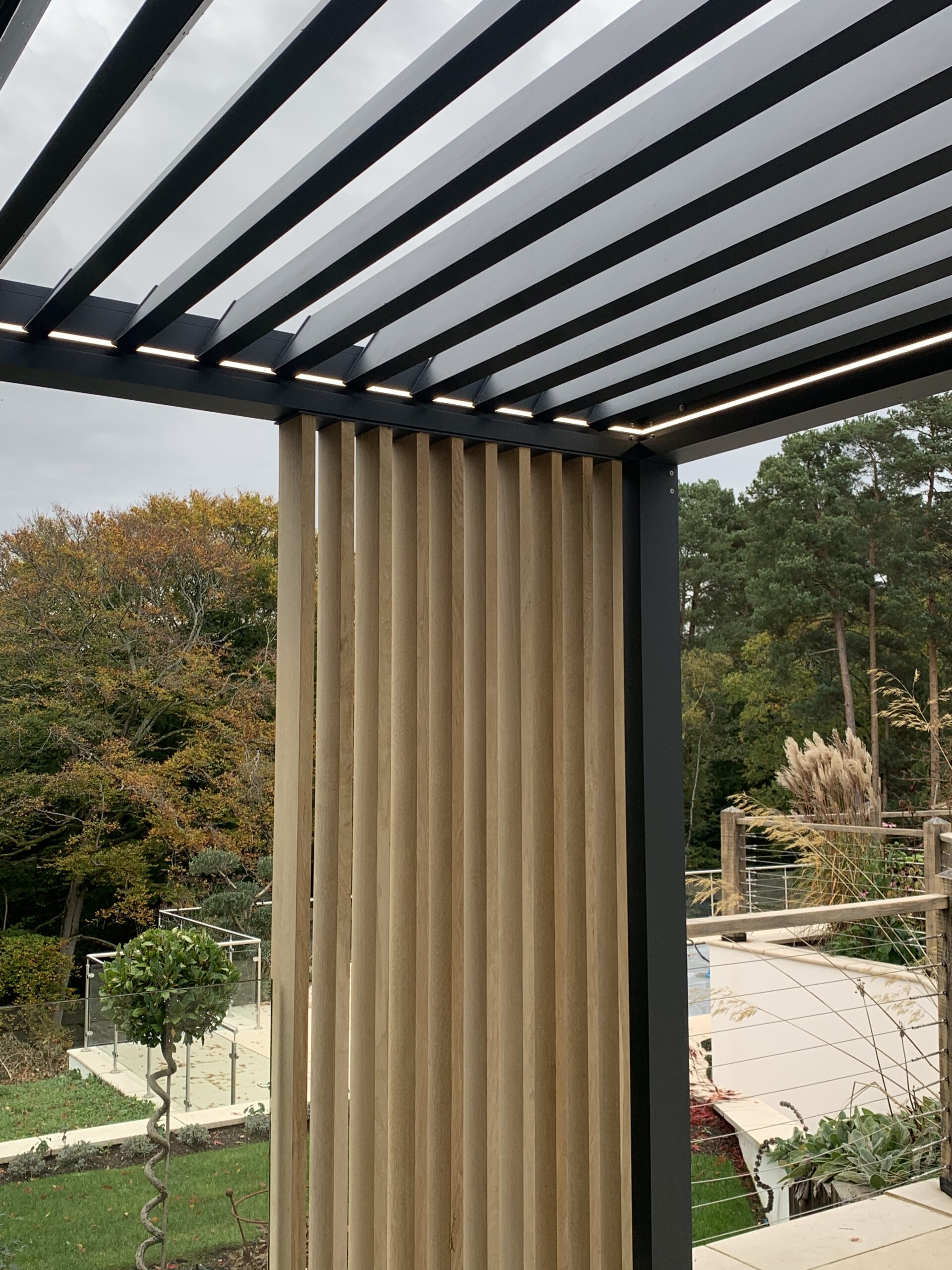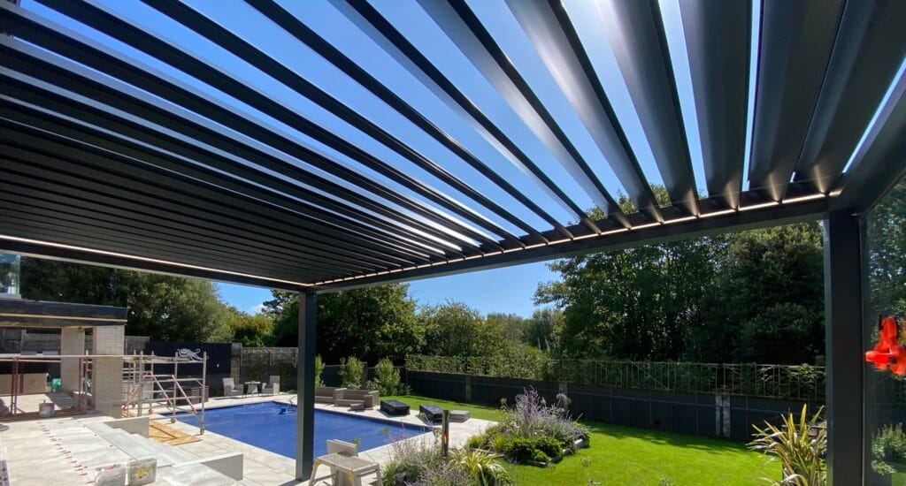 Transform your outdoor space with a bespoke aluminium pergola featuring adjustable motorised louvres for year-round comfort and weather protection.