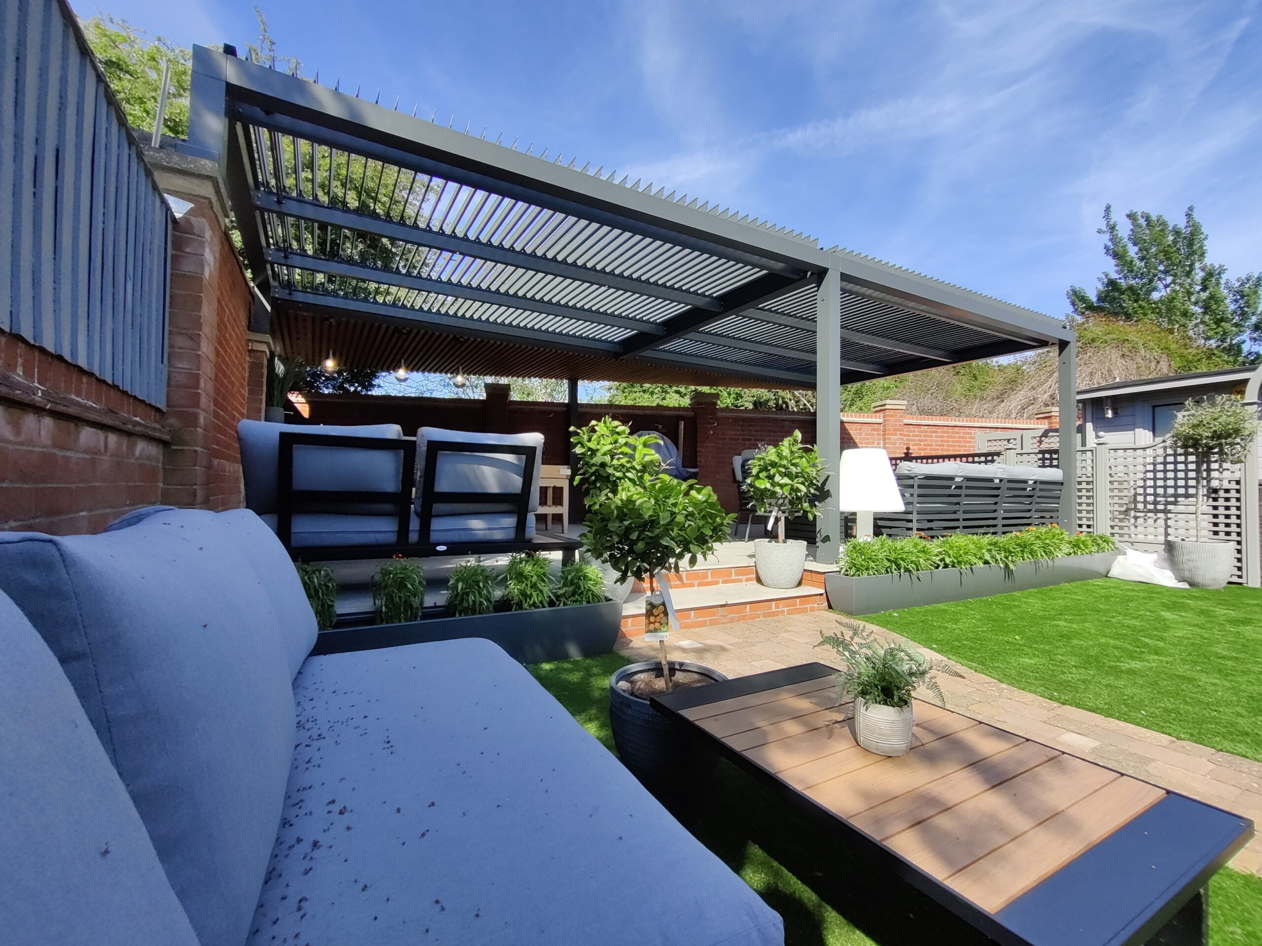 To ensure the living/dining space below the pergola still benefits from sun light, we included a motorised louvre roof. This gave the client control of how much sun light they wanted within the space, also allowing it be fully closed during sudden down pours. Along the front of the patio, we design and fabricated bespoke rolled planters to marry into the design and frame the area.