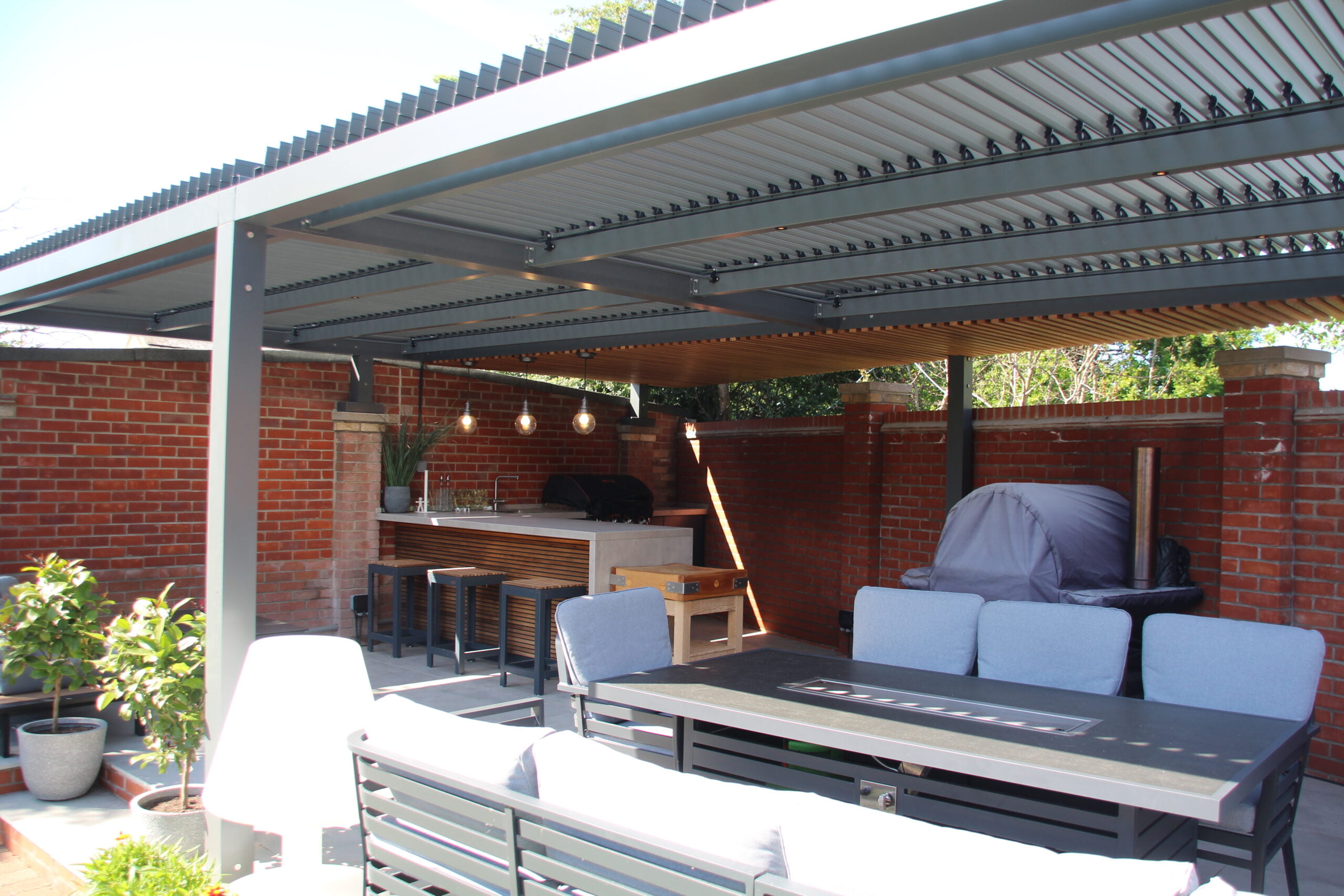 To create an inviting and usable kitchen/dining space with a structure that gives the client a usable space through all seasons. Using elements from the kitchen design, we designed a bespoke pergola frame which angled into the corner of the clients garden. Creating the bespoke shape meant we maximised the usable. Over the kitchen, we designed in a full flat roof with integrated LED lighting to give the cooking area full weather protection. To soften the design and to marry the pergola design in with the kitchen, we introduced iroko battens within the soffit.